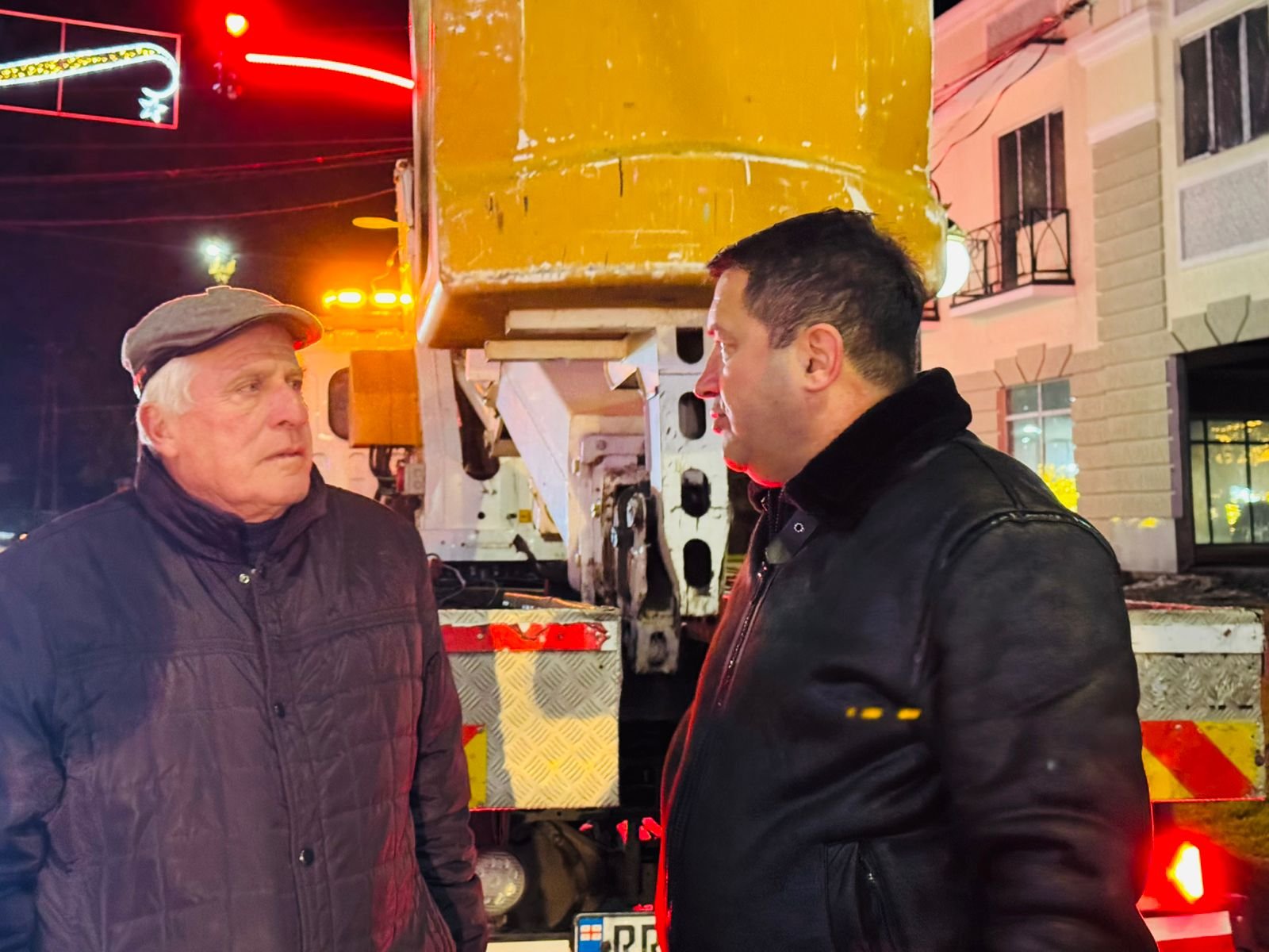 ალაქში ილუმინაციების მონტაჟის პროცესს მუნიციპალიტწტის მერი, დავით ბახტაძე აკვირდება.